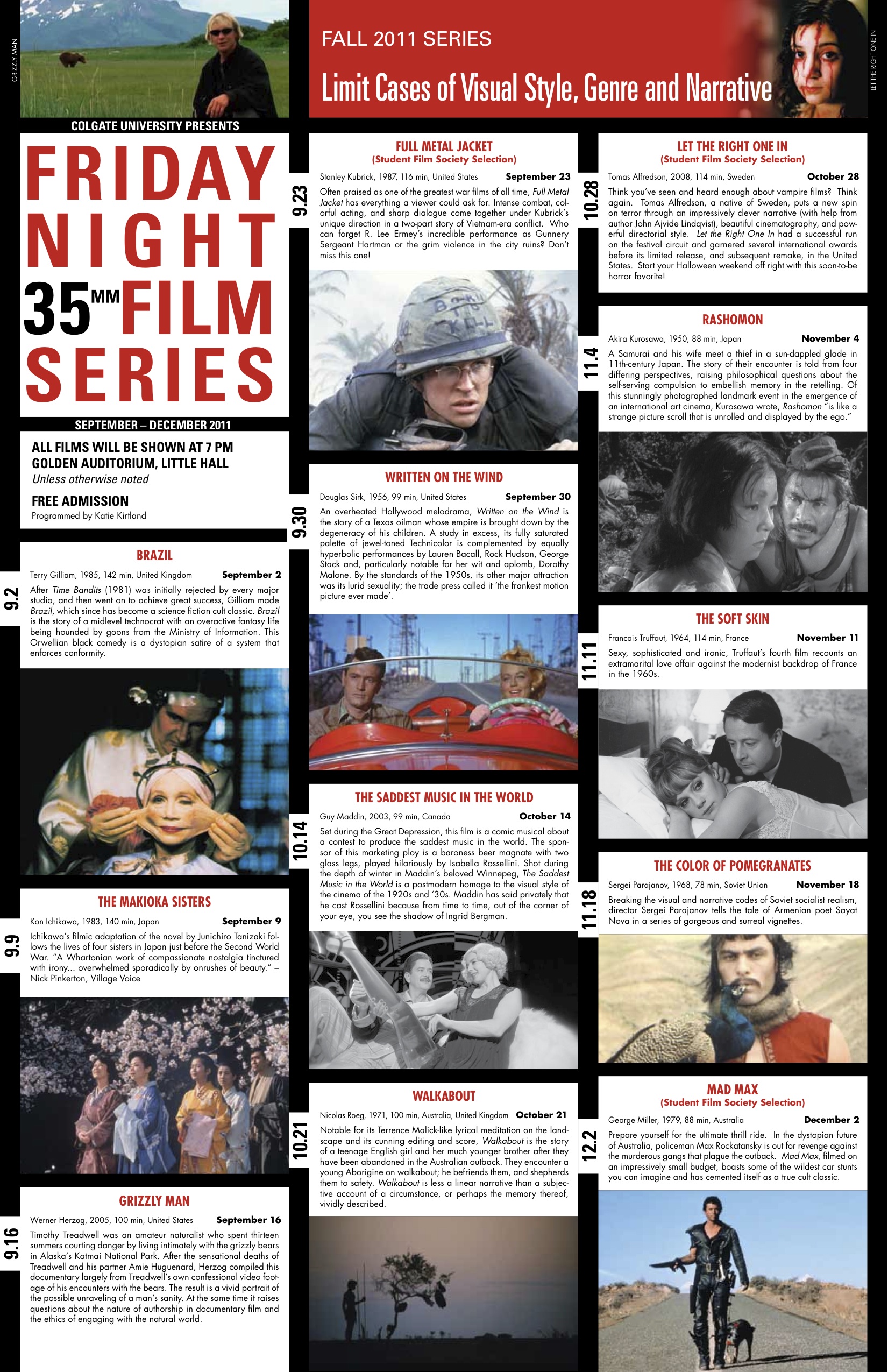 – Co-programmer for Friday Night Film, semester-long film series, Colgate University, Fall 2011 (click to enlarge)
